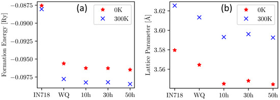 The formation energies of the FCC phase in Figure 9a exhibit lower values for all states of the CCA compared to IN718, implying increased thermodynamic stability. While the free energy of formation of the FCC phase in the CCA noticeably decreases from WQ to 10 h of aging, it stays nearly constant with further aging, agreeing with only minor changes in the chemical composition of the matrix. This effect is even more pronounced when looking at the calculated lattice parameters of the matrix phase in Figure 9b. Its value significantly decreases from 3.613 Å to 3.593 Å for 300 K during the first aging step from WQ to 10 h and is again staying rather constant with further aging. The comparison to IN718 shows a higher value for the lattice constant of FCC in IN718 alloy compared to all states of the CCA. The influence of temperature on the formation energy can be seen in Figure 9a, where all values at 300 K are lower than the corresponding values at 0 K, showing stabilization of FCC with increasing temperature. Conversely, the lattice parameter, shown in Figure 9b, increases from 0 K to 300 K by approximately 0.04 Å due to the thermal expansion of solid matter [38]. It should be noted that the trends for the comparison to IN718 are qualitatively the same for both considered temperatures.