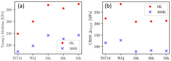 Figure 10 shows the calculated Young’s modulus and critical resolved shear stress (CRSS) of the matrix phase for the different heat treatment states, where the results are also compared to IN718. Young’s modulus is obtained by DFT calculations as described in [35], and the CRSS is derived according to the contribution of the solute-dislocation interaction according to the Varvenne-Curtin model [33], based on the results of DFT calculations of the elastic moduli and misfit volumes [32].