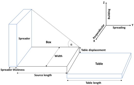 The powder spreading direction is along the Y-axis, the additive manufacturing build direction is along the Z-axis, and the direction perpendicular to the spreading direction is along the X-axis. Before the spreading simulation can start, the amount of powder must be determined that is used for the simulation. This amount was calculated using the dosing factor. The dosing factor relates the powder mass used for the simulation to the mass that the volume comprised by the table area times the table height would have if it was filled completely with solid material, i.e., with solid IN718 in this study. For example, a dosing factor of 0.6 indicates that the powder mass used for the simulation is 60% of the mass of IN718 which completely fills the simulation volume of table area times table height. Once the powder mass is known, the total number of powder particles is determined from the known size distribution of the powder particles, and the size distribution is divided into size bins. The particles are distributed in each bin according to the relative distribution of particles according to the size distribution and the total number of particles. The DEM process starts with a heap of powder on the source table. This heap is generated with a gravity-driven drop of the particles from a virtual box that is located above the source table. This box is filled with particles such that the largest particles in the distribution are placed first randomly within the box volume, followed by the second largest particles, etc. After a brief time delay, the spreader starts time, which aims to settle all particles on the source table, the spreader then pushes the powder heap from the source table onto the table. The term “spreader” is used in this work, but sometimes “recoater” is used in the literature. For this study, the spreader was a rectangular box and elastic deformation of the spreader was not considered.