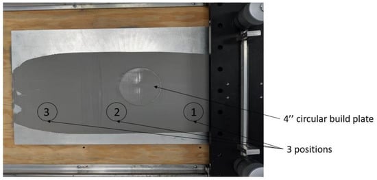 Top view of experimental setup for spreading IN718 powder over a flat plate. Spreading direction right to left. The powder was removed from locations 1–3, which represent an overall distance of 300 mm.