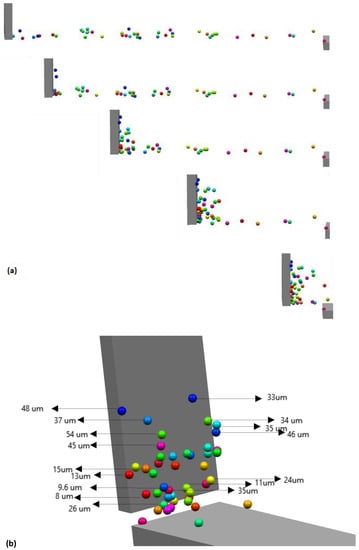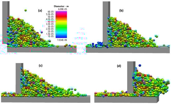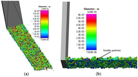 The simulation results shown in Figure 7a depict the surface of the powder after the software dispensed powder onto the source table while Figure 7b depicts the underside of the power. Several particles are visible in Figure 7b that are blue in color and therefore about 10–15 µm in diameter. On the upper side of the powder, only a few blue particles are visible while several red particles are visible. The red particles are among the largest particles of the powder size distribution with a diameter of about 50 µm. Large particles at the top of the powder and small particles at the bottom suggest a size segregation in the starting powder bed before spreading. The vertical size segregation observed in the current DEM simulation for the spreader table has been attributed in the literature to the ability of small particles to move into inter-particle spaces of larger particles when the particle aggregate dilates, for example when poured or vibrated [24].