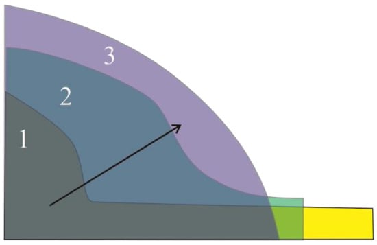 The sequence of powder pile envelop during the spreading over source table. Numbers 1, 2, 3 are indicating the three different positions of the powder pile on the source table as shown in Figure 8a–c respectively.