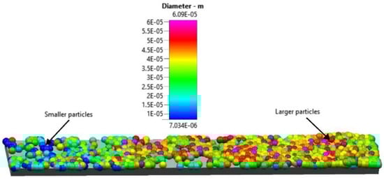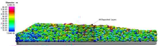 The result of the powder spreading of one layer over the starting plate is shown in Figure 11. The DEM simulation result shows a qualitative size segregation in the spreading direction with the larger particles located toward the end of the 4 mm raking distance and the smaller particles toward the beginning. The DEM simulation was then used to highlight the trajectories of individual particles in the powder pile during the spreading process.
