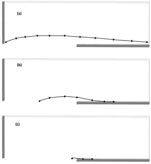 (a) The trajectory of individual 49 µm diameter particle across the source and spreader table that was located near the blade at the beginning of the blade motion. (b) Same as (a) but the particle was located halfway along the source table initially. (c) Same as (a) but the particle was located toward the right end of the source table initially.