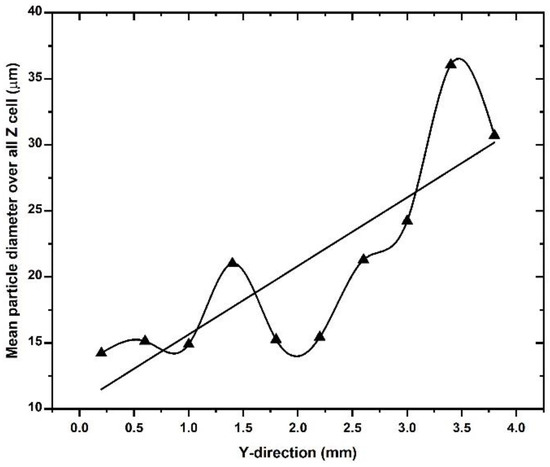 The mean powder particle size on the build plate was analyzed quantitatively using data on the mean particle size in each cell of the powder bed volume. The number of particles analyzed per cell is approximately 300–500. An average was taken of the mean particle sizes in each of the 10 cells in the z-direction for each cell step in the y-direction. The result is shown in Figure 14 and confirms the qualitative observation from Figure 11 that the mean particle size increases along the spreader direction. The increase is highly irregular, which could be caused by the relatively small number of particles in the analysis. The increase in the mean particle size along the spreading direction must be seen in the context of the larger particles moving upward during the spreading process. Figure 13a suggests that this upward motion affects the trajectory and final location of the larger particles, which appears to be shifted to the right at the build plate.