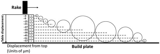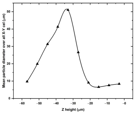 For the five cells at the bottom of the powder bed at −57 µm, −51 µm, −45 µm, and −39 µm, the mean particle diameters approximately touch the build plate. The largest particle in Figure 16 is roughly the same size as the largest particle in the starting powder size distribution. Since the particles cannot extend into the build plate, the maximum in Figure 15 cannot occur at depths less than the observed cell at −33 µm. The largest particles would be likely raked off the build plate if they were located higher in the powder bed than at the current location of −33 µm in Figure 15. The maximum in Figure 15 is therefore a “geometrically necessary” maximum while the nearly linear drop in mean size toward the bottom of the late is equally geometrically dictated if the particles with the mean sizes indicated in the plot in Figure 15 rest on the build plate. Toward the top of the powder bed, none of the particles in the plot in Figure 16 extend beyond the zero level which represents the motion of the bottom of the rake blade over the build plate. If particles would extend beyond the zero level it can be postulated that these particles would be pushed with the spreader and its blade off the powder bed. The distribution of particles with mean diameters for z-levels from −3 μm to −27 μm must represent a topological way for these particles to be distributed on the particles that rest on the build plate.