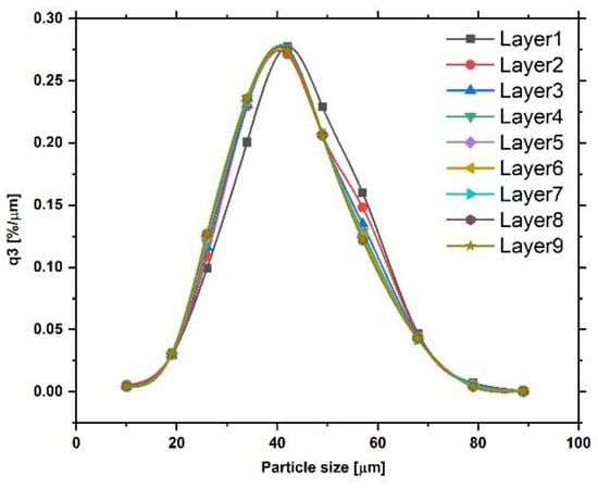 Unlike in an experiment, the DEM simulation can analyze the powder size distribution of any individual layer. The powder particle size distribution was nearly identical for layers three to nine as shown in Figure 18. The size distribution in each layer captures all particles on the build plate that were spread over previous layers. Only layers one and two deviated slightly from the distribution of the other layers. The size distribution of the starting powder was modeled after the experimental size distribution shown in Figure 3 for IN718. The size distributions beyond the first two layers, therefore, agree with the starting size distribution. However, within a layer and as a function of the spreading distance, the particle sizes de-mix, as shown in Figure 14.