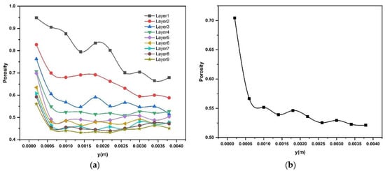 Effect of longitudinal positions of the build plate on the powder particle porosity (a) in different deposited layers (b) average porosity of powder bed in all layers.