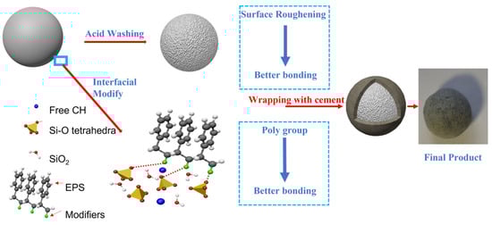The incorporation of hydrophilic polymers can improve the interfacial properties of cementitious materials and EPS materials [14,15]. Most of the current research has used vinyl acetate and styrene butadiene rubber as cementitious material bond modifiers [16,17]. Other modifiers, including ethylene–vinyl acetate (EVA), styrene–butyl acrylate emulsion (SAE), polyacrylic ester (PAE), etc., were also used to improve the interfacial properties [12,15]. According to the research of DA Silva et al., acetate ions caused by EVA hydrolysis reacted with Ca(OH)2 to produce hydrated calcium acetate and polyvinyl alcohol, reducing the quantity of Ca(OH)2, but, also, EVA-modified cement pastes showed expressive formation of polymeric film deposited on the surface of anhydrous and hydrated cement phases, partially sealing pore walls [18]. VAE can also modify the EPS–cement interface, and increase the thermal properties and mechanical properties of mortars [19]. EPS granules can be hydrophilized by using 0.2% sulfonyl and 0.03% bone glue hydro solution [20]. Chen used triethanolamine and polyvinyl alcohol to modify the surface of EPS, and then wrapped organic cementing composites on the surface of EPS as a “shell”. The results showed that the strength of core–shell lightweight aggregates increased 21% compared with the aggregates without the “shell” [21]. Sodium alginate, xanthan gum, styrene–butadiene rubber emulsion, and diatomite admixtures can also be used in improving the strength and shrinkage behavior of EPS lightweight concrete [22,23]. Above all, the preparation of core–shell structured lightweight aggregates using EPS as the core, along with interfacial modification of EPS using interface agents, would also be a feasible way to prepare better lightweight aggregates.