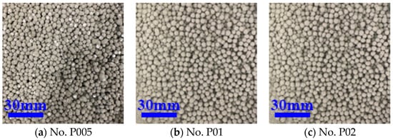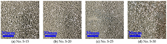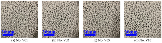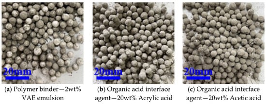 From Table 5, it can be found that the effect of these two interface agents on EPS WER increased as their concentration increased, and the effect of acrylic acid interface treatment is better than that of acetic acid. From the perspective of WER, both acrylic acid and acetic acid concentrations above 20% can achieve a better WER. Compared with the polymer binder, the fall resistance of the aggregates treated by an organic acid interface agent is better. As shown in Figure 5, the shell layer of the aggregates treated by the binder for initial molding was all peeled off after falling, while the aggregates treated by the organic acid interface agent were mostly not peeled off after falling. In the actual production of core–shell lightweight aggregate, the organic acid-based interfacial agent-treated EPS has better fall resistance and is more beneficial for the preparation of core–shell lightweight aggregate.