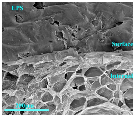 Untreated EPS surface and internal structure are shown in Figure 6. The internal structure of EPS is porous and laminar, and the surface is covered with a film which is continuous and smooth. EPS–cement interface is not compatible, so the bonding of EPS surface and cement is more difficult. Therefore, different interface agents were selected to treat the EPS surface, and study the improvement of the interface between the cement matrix and EPS after their addition.
