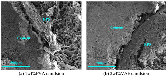 The effect of polymer binder PVA emulsion and VAE emulsion treatment on EPS–cement interface is shown in Figure 8. Comparing Figure 8 to the sodium silicate group, at the same magnification of 200 times, the two groups of binder in the EPS–cement interface at the gap were larger, and the delamination was obvious, indicating that the polymer binder treatment of EPS–cement microscopic interface was not dense, and, thus, the choice of binder interface treatment alone was not ideal.