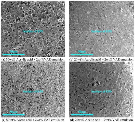Based on the previous tests, a class of interfacial agents was considered to increase the roughness of the EPS surface, and the SEM of the EPS after surface treatment with the acrylic acid and acetic acid composite binders is shown in Figure 9. As shown in Figure 9, organic acid interfacial agents—in this work, acrylic acid and acetic acid—can slightly corrode the EPS surface so that the EPS surface becomes rough, with corrosion appearing as relatively uniform holes. With a reduction in the amount of acrylic acid doping, EPS surface corrosion was also reduced. As shown in Figure 9a,d, the corrosion effects of 20% acetic acid and 50% acrylic acid were similar. At the 50% acetic acid interface, as shown in Figure 9c, hydration products firmly covered the EPS surface and could not be peeled. In terms of corrosion effect, the effect of acetic acid is better than that of acrylic acid.