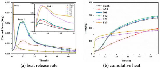 Five representative groups of interfacial agents and blank cement groups were selected for the heat of hydration exothermic experiments: S-25 for the sodium silicate group; PVA emulsion P01 and VAE emulsion V02 for the binder group; and organic acid interfacial agents acrylic acid L20 and acetic acid T20. Figure 11 demonstrates the effects of different interfacial agents on the heat of hydration of cement.