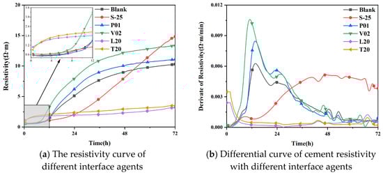The electrical resistivity of cement-based materials changes with the process of cement hydration, so it is usually used to describe the hydration process of cement-based materials and judge the effect of chemical admixtures on cement hydration [34]. The impact of different interface agents on the resistivity of cement are shown in Figure 12.