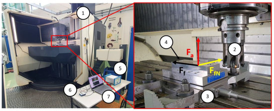View of the test stand and machine workspace: (1) machine tool; (2) cutting tool; (3) dynamometer; (4) test sample; (5) charge amplifier; (6) A/C converter; (7) computer.