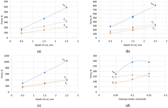 Components of the cutting force: (a) in the function of depth of cut, fz = 0.05; (b) in the function of depth of cut, fz = 0.1; (c) in the function of depth of cut, fz = 0.15; (d) in the function of feed, ap = 0.5; (e) in the function of feed, ap = 1.5; (f) in the function of feed, ap = 2.5.