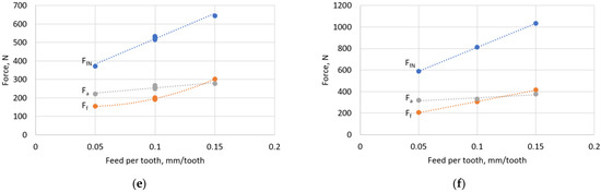 For constant values of feed per tooth (Figure 6a–c), the change in all components of the cutting force has a linear form. However, it can be seen that depending on the value of feed per tooth, the intensity of the increase in the components Ff and Fa, and their relationship to each other, changes. For a small value of feed per tooth (fz = 0.05 mm/tooth), the Fa component is clearly greater than the feed component by about 50%. For a feed rate twice as large, the difference decreases. In contrast, for a feed rate of fz = 0.15 mm/tooth, the Ff component is slightly larger than the axial component. The effect of feed per tooth on the axial and feed components of the cutting force can be clearly seen in the graphs of Figure 6d–f. It can be observed that, as the feed per tooth increases, the feed component Ff increases much more strongly than the axial component. It can even be said that the value of the axial force component hardly depends on the feed per tooth. On the other hand, the Ff component increases monotonically as the parameter fz increases. This increase is so strong that at a feed rate of 0.15 mm/tooth, the Ff component exceeds the value of the Fa component. This can be explained by the fact that, as the feed rate increases, the cross section of the cut layer increases only in the feed direction, and the shape of the layer does not change. Therefore, the higher the feed rate, the greater the resistance that acts on the tool in the feed direction. This results in an almost proportional increase in the Ff component.