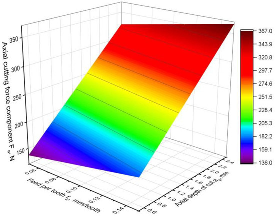 The Fa axial component model has the simplest form. It contains only linear components. It does not include quadratic components and two-way interaction factors. However, the fit of the model to the experimental data is very good, with a coefficient of R2 = 0.97. Such a simple form of the model is due to the fact that there is no motion in the direction of the tool axis and the cutting process, i.e., the cutting speed vector and the feed vector act in a plane perpendicular to the tool axis. As can be seen from the response surface analysis presented in Figure 9 and the results of the analysis of variance presented in Table 6, it is the depth of the cut that has the greatest influence on the axial component of the cutting force. The contribution of the ap factor in the model is as high as 93%, which means that it is the most important. The feed-per-tooth parameter has a very small F-value compared to ap. Moreover, the p-value parameter for feed per tooth has the highest value. Both facts prove that the feed rate in the obtained model is of little importance. This is because the feed is carried out in the direction perpendicular to the tool axis and axial force component.