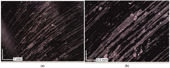 The irregularly distributed particles of workpiece material remaining on the surface are the result of adhesion phenomena. Despite using the cutting parameters and machining conditions recommended by the tool manufacturer, it was not possible to achieve a good surface quality. The adhesion phenomenon occurred regardless of the values of the technological parameters. Therefore, cutting tests were repeated using a semisynthetic water-based coolant emulsion with a concentration of 5% and surface roughness was measured again. A view of the surfaces obtained after milling with coolant is shown in Figure 11. It can be seen that adhesion phenomena were almost completely eliminated. In Figure 11b, it can be clearly seen that traces of cutting insert passes dominate and adhesion of the workpiece material is sporadic.