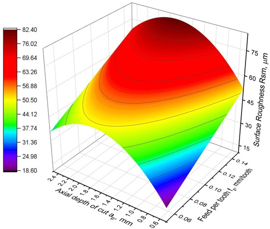 The obtained relationship is characterised, similarly to the Ra parameter, by a very good fit to the experimental data, as the coefficient R2 = 0.96. On the other hand, similarly to the model for the Rz parameter, the fz2 factor is not present. This means that the RSm parameter, like Rz, is characterised by a linear dependence on the feed to the cutting edge, which is proven by the graphical presentation of the model in Figure 14. The function of the RSm parameter is very similar to that of the Rz parameter, but the depth-of-cut parameter is as significant as the others. In the cutting depth direction, the shape of the function is parabolic, with a maximum at ap = 1.8 mm. However, it can be clearly seen that the value of the RSm parameter for greater depths of cut is significantly higher than for the smallest depth of cut. The results of the analysis of variance for the developed model confirm the analysis. The values of the F-value and p-value parameters, which have almost identical values for all factors in the model, are notable (Table 9).