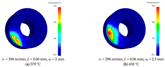 This section gives some temperature simulation cloud diagrams with different combinations of cutting parameters in Table 4, as shown in Figure 6. The temperature simulation cloud pictures under other cutting parameter combinations are no longer listed individually.