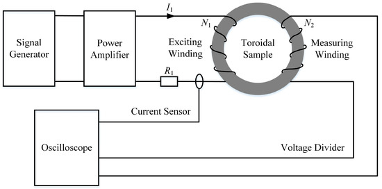 Figure 1 shows the schematic diagram of the test system. The excitation waveform was generated by the signal generator (Tektronix AFG 2021-SG, which was purchased from Corey Instrument, Shenzhen, China). The power of the signal generator was too low to fully magnetize the sample. The wideband power amplifier (ATA-4014, which was purchased from Aigtek, Xi’an, China) was used to amplify the pulse waveform and excite the toroidal sample. The current sensor (PEARSON Current Monitor, which was purchased from Shanghai Linhorn Electromechanical Technology Co., Shanghai, China) and the voltage divider (PINTECH DP-25, which was purchased from Guangzhou Deken Electronics Co., Guangzhou, China) measured the excitation current and induced voltage, respectively. The oscilloscope (KEYSIGHT InfiniiVision DSOX2024A, which was purchased from Shenzhen Kezhongke Instrument Co., Shenzhen, China) was used to detect the excitation waveforms and collect the excitation current and induced voltage at the same time.