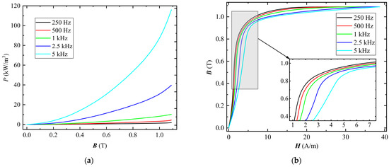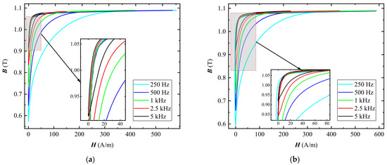 Figure 2 shows the hysteresis loops when the sample is magnetized under sinusoidal excitation at 1 kHz. Figure 3a,b show the loss and magnetizing curves, respectively, when the sample is magnetized under sinusoidal excitation at different frequencies. As the frequency increases, the core loss increases and the permeability decreases, as shown in Figure 3. According to the Bertotti loss separation theory [26], the total loss Ptot is composed of the hysteresis loss Phys, eddy current loss Peddy, and anomalous loss Panom. With the increase in frequency, the Phys remains unchanged while the Peddy and Panom increase, so the Ptot increases. In addition, the magnetic domains in the FE-N core cannot keep up with the rapid changes of the current in the excitation winding with increasing frequency, which results in a decrease in permeability.