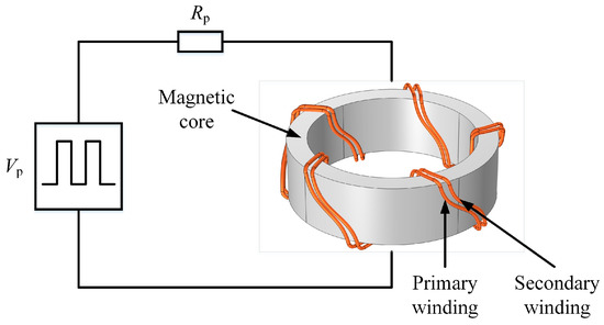 The simulated experimental setup consisted of a toroidal core, which forms a closed magnetic flux path. The primary and secondary coils in the simulated experimental setup were wound uniformly around the core, as shown in Figure 5. Hysteresis effects are considered to simulate the magnetic behavior of the FE-N magnetic core. In the model, the primary and secondary windings are made of Litz wires, whose diameter is less than the skin depth. Thus, these windings are modeled as a muticoil conductor that neglects the eddy current effect. The primary winding is connected to a primary resistor, Rp, and the pulse voltage source, Vp, while the secondary winding is set to the open circuit, Icoil = 0 A. Several important design parameters such as the frequency and duty cycle of the input pulse are parameterized and therefore can be easily changed.