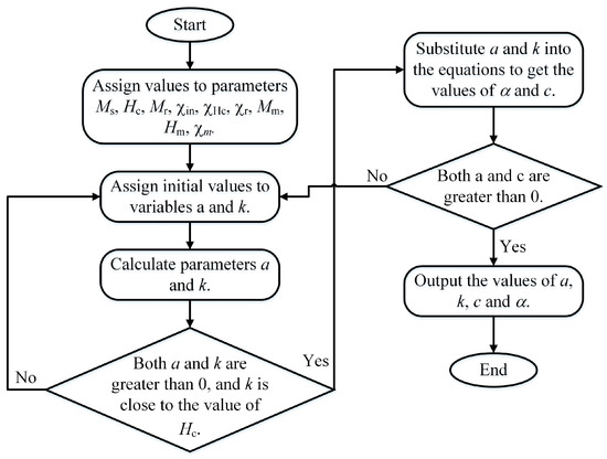 where Man is the anhysteretic magnetization. In order to improve the calculation speed, the system of equations is eliminated first. Ostensibly, each of the four parameters can be expressed in terms of the other three parameters so that three equations can be eliminated and only one equation needs to be solved. However, the hyperbolic cotangent function of Man requires two parameters, a and a, which makes the elimination of three parameters extremely difficult. Therefore, for the sake of feasibility, only two parameters are eliminated. Two equations are kept and solved by the given initial values. Considering that the FE-N core selected in this paper was a soft magnetic material, the domain pinning parameter k should be retained. Because the coercivity of the soft magnetic is close to k, it is convenient to assign an initial value to parameter k and verify the calculation results. The iterative process is shown in Figure 6. Step 1: input the calculated values obtained by the experiment. Step 2: attach initial values to variables a and k. The value of parameter k should be close to the coercivity. Step 3: Calculate a and k and judge whether they are both greater than 0 and whether k is close to the coercive force Hc. If the above conditions are not met, return to step 2 and reattach the initial value until it is met. Step 4: Substitute the values of a and k to the system of equations to calculate the parameters a and c. Check whether a and c are both greater than 0. If not, return to step 2 until both are greater than 0. Step 5: output the values of parameters a, k, a, and c.