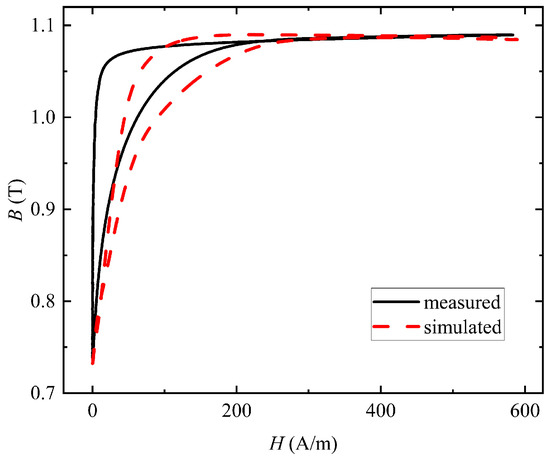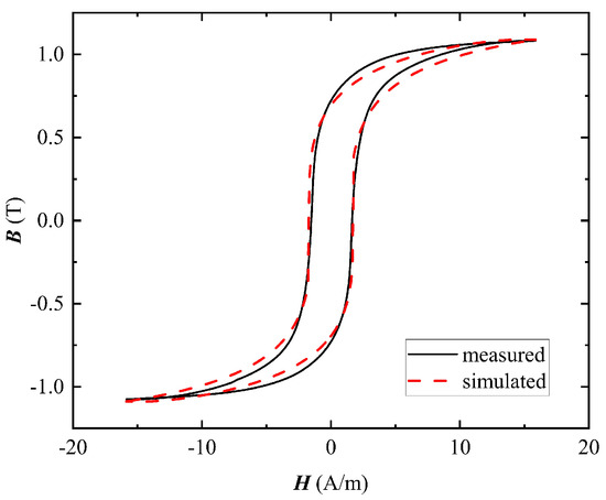 In order to verify the accuracy of the model, the static limit hysteresis loop of the core is calculated. The comparison results of the simulated and measured values of the hysteresis loop model are shown in Figure 7. As can be seen from the comparison results of the hysteresis loop, the simulated values are in good agreement with the experimental measurements.