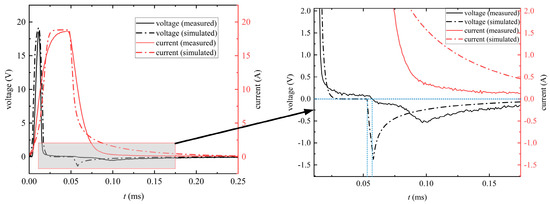 Figure 8 describes the induced voltage in the secondary winding and the currents flowing through the primary winding when the pulse frequency was 1 kHz and the duty cycle was 5%. It can be seen that the simulated induced voltage and excitation current waveforms were basically consistent with the measured waveforms. The rise and fall times of the pulse source in the simulation were set as 200 ns, which was also the rise and fall times of the pulse signal given by the signal generator. The pulse waveform in the experiment was not an ideal square wave, and its rise and fall times were difficult to define. Additionally, due to the limitation of the switch inside the power amplifier in the test system, the rise time and fall time of the pulse excitation in the experiment were bound to be longer than those in the simulation, which led to the rise and fall parts of the simulated excitation current waveform being steeper than the measured waveform. In addition, the parameters of the toroidal core in the simulation were set to be isotropic. However, in practice, the parameters of the nanocrystalline core were anisotropic due to the influence of processing technology. So far, there are no studies on measuring the anisotropic magnetic parameters of the nanocrystalline toroidal sample. As can be seen from Figure 7, the nanocrystalline core in the simulation could not be more finely modeled, which is also the reason why the simulation excitation current waveforms were different from the experimental waveforms. Last but not least, the induced voltage is changed from a positive to negative value when the excitation current began to drop. The excitation current waveform in the simulation decreased faster than that in the measurement, so the minimum induced voltage in the simulation was smaller than that in the measurement.