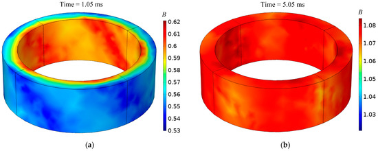 Magnetic flux density at different times: (a) t = 1.05 ms; (b) t = 5.05 ms.