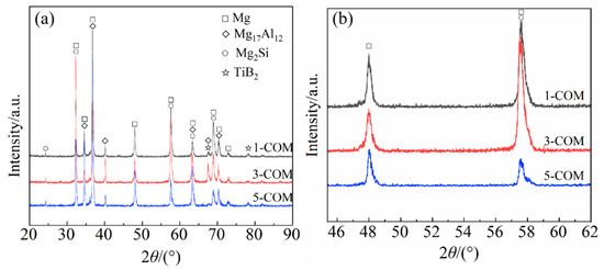 XRD patterns of TiB2/Mg-4Al-1.5Si composites: (a) 20° ≤ 2θ ≤ 90° and (b) 46° ≤ 2θ ≤ 62°.