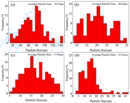 Size distributions of the primary Mg2Si phases in the alloys and the composites, (a) M-AC, (b) 1-COM, (c) 3-COM, and (d) 5-COM.