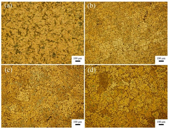Metallographic photos of the alloys and composites showing the morphology of α-Mg grains: (a) M-AC, (b) 1-COM, (c) 3-COM, and (d) 5-COM.