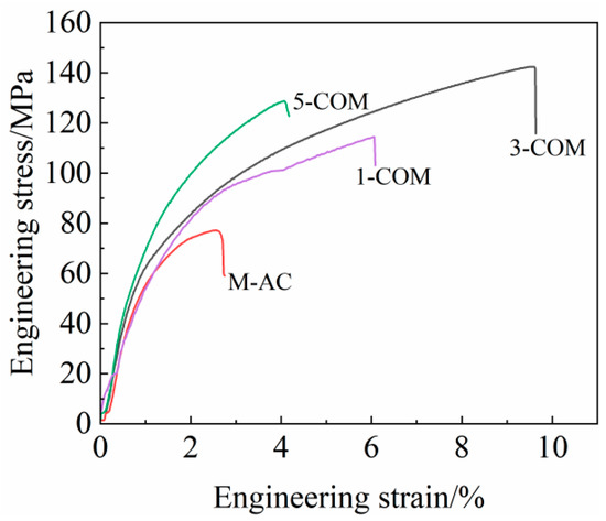 Figure 8 shows the Vickers hardness of the alloys and the composites. It is seen that the hardness of the composites increases monotonically with the increase of TiB2 content. When TiB2 content is 5 vol.%, the hardness of the 5-COM reaches a maximum value of 153 HV, which is 173.2% greater than that of the matrix alloy. Figure 9 shows the engineering stress-strain curves of the alloys and the composites at room temperature, and the corresponding ultimate tensile strength (UTS), yield strength (YS), and elongation (EL) are listed in Table 1. UTS, YS, and EL of the TiB2/Mg-4Al-1.5Si composites with different TiB2 contents are higher than those of the matrix alloy. As the TiB2 content rises, YS increases monotonically, while UTS and EL increase at first and then decrease, reaching a maximum when TiB2 content is at 3 vol.%. The UTS, YS, and EL of the 3-COM are improved by 69.93%, 10.56%, and 187.5%, respectively, compared with the M-AC. When the TiB2 content rises to 5 vol.%, the YS of the 5-COM is improved by 31.5%, but the UTS and EL decrease slightly. Therefore, it can be concluded that the strength and ductility of the Mg-4Al-1.5Si alloy can be simultaneously enhanced by adding an appropriate amount of TiB2 nanoparticles, and desirable, comprehensive, mechanical properties can be obtained by adding 3 vol.% TiB2 nanoparticles.