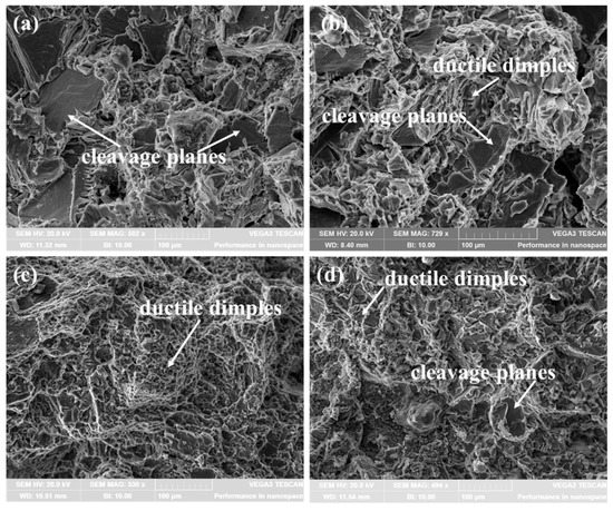 The improvement of ductility of the composites is mainly due to the refinement and homogeneous dispersion of the Mg2Si phases. The primary Mg2Si phases and the eutectic Mg2Si phases in the M-AC exhibit a coarse, dendritic shape and a Chinese character shape, respectively, and the sharp tips and edges of the Mg2Si phases provide an easy path for crack propagation, and the fracture path moves preferentially through these regions. Therefore, the EL of the Mg-4Al-1.5Si alloy is only 3.2%, as shown in Table 1. Figure 10 presents the fracture surfaces of the alloy and the composites. The fracture surface of the alloys is characterized by smooth cleavage planes, suggesting that it belongs to a brittle fracture mode (see Figure 10a). After adding 1 vol.% TiB2 nanoparticles, the stress concentration level is decreased, and microcrack initiation is delayed due to the refinement and uniform distribution of the Mg2Si phases, and the EL of 1-COM consequently increased to 5.1% (Table 1). As shown in Figure 10b, the area of the cleavage planes decreased in the fracture surface of the 1-COM, and a small number of dimples appeared on the fracture surfaces, which means it was a quasi-cleavage fracture mode. When the TiB2 content rose to 3 vol.%, the Mg2Si phases were further refined, and the distribution of the primary Mg2Si phases was more uniform, which increased the compatible deformation capability of the composites, the EL of 3-COM consequently increased to 9.2% (Table 1). The fracture surfaces of the 3-COM were almost covered with a large number of small dimples, indicating the dominant fracture behavior is a ductile fracture (see Figure 10c). When the TiB2 content reached 5 vol.%, due to the relatively lower distribution uniformity of the primary Mg2Si phases and the existence of large primary Mg2Si phases in the 5-COM, the EL of 5-COM was only 3.4% (Table 1). Dimples and cleavage planes coexist in the fracture surface of the 5-COM, indicating that the fracture mode changed from ductile fractures to quasi-cleavage fractures again (Figure 10d).