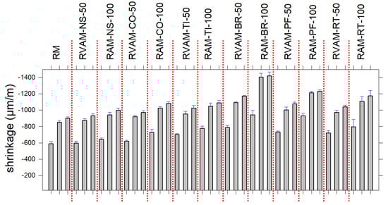 The shrinkage values and trends at 14, 28 and 91 days are displayed in Figure 2. Overall, the shrinkage rates of all mortars are high until 28 days and then change poorly from 28 to 91 days (Figure 2, Table S3). The highest shrinkage occurs for RAM-BR-100, 1.421 µm/m at 91 days, followed by that of RAM-PF-100, 1.233 µm/m at 91 days and then RAM-RT-100, 1.175 µm/m at 91 days. Then, the RAM-TI-100 and RAM-CO-100 values are lower than the previous three RAMs and are very similar between them, being 1.090 µm/m and 1.082 µm/m at 91 days, respectively (Figure 2, Table S3). Finally, RAM-NS-100 and RM display the lowest values of shrinkage, 0.998 and 0.902 µm/m at 91 days, respectively (Figure 2, Table S3). The trends of shrinkage of mortars made of both VS and RA, i.e., RVAMs are invariably lower than that of the corresponding VA-free ones (RAMs) (Figure 2, Table S3).
