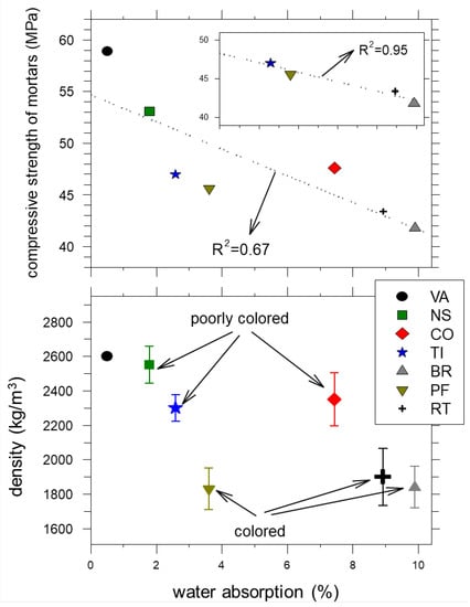 The classical relationships between mechanical performance (compression), density and water absorption for mortars can be globally summarized here but can be rationally interpreted only in light of the petrography and mineralogy of aggregates, as shown in Figure 8. The water absorption of the six CDW groups is plotted versus their density (different CDW specimens), as well as their colour. RA-NS-100, RA-CO-100 and RA-TI-100 are generally lightly coloured and with a high density, whereas RA-BR-100, RA-PF-100 and RA-RT-100 are low-density and darker coloured. These attributes combine with the mechanical properties of corresponding RAMs, since the former CDW types have higher compressive strength than the latter ones (Figure 8). In general, a high water absorption determines a progressive decrease in compressive strength. However, it is noteworthy that the compressive strength of CDWs made of silicate phases and are calcite-poor or calcite-free (RA-TI-100, RA-BR-100, RA-PF-100 and RA-RT-100) fit a unique linear regression (Figure 8). On the other hand, the calcite-rich RA-CO-100, although having a high porosity, has a compressive strength even larger than silicate-rich RA-TI-100 (Figure 8).
