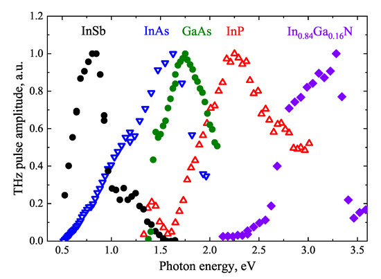 - Adomavičius, R.; Molis, G.; Krotkus, A.; Sirutkaitis, V. Spectral Dependencies of Terahertz Emission from InAs and InSb. Appl. Phys. Lett. 2005, 87, 261101. [Google Scholar] [CrossRef]