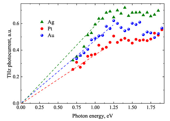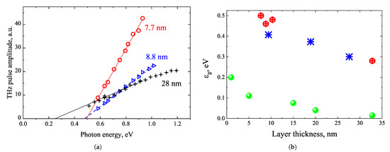 - Reklaitis, A. Crossover between Surface Field and Photo-Dember Effect Induced Terahertz Emission. J. Appl. Phys. 2011, 109, 083108. [Google Scholar] [CrossRef]