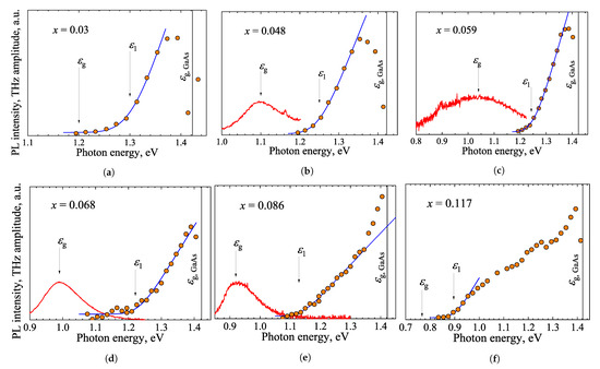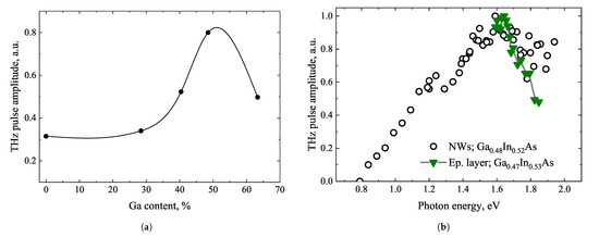 - Beleckaitė, I.; Treu, J.; Morkötter, S.; Döblinger, M.; Xu, X.; Adomavičius, R.; Finley, J.J.; Koblmüller, G.; Krotkus, A. Enhanced THz Emission Efficiency of Composition-Tunable InGaAs Nanowire Arrays. Appl. Phys. Lett. 2017, 110, 201106. [Google Scholar] [CrossRef]