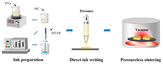 The fabrication process of porous SiC ceramics contains three steps: ink preparation, direct-ink-writing (DIW)-based 3D printing, and pressureless sintering, as illustrated in Figure 1.