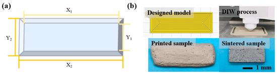 (a) Schematic diagram of sample shape; (b) designed model, direct-ink-writing 3D-printing process, and images of the samples after printing and sintering.