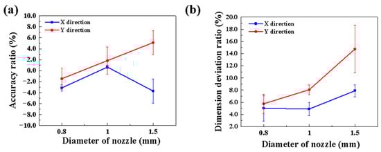 (a) accuracy ratio (AR) and (b) dimensional deviation ratio (DDR) of the SiC green bodies for different nozzle diameters.