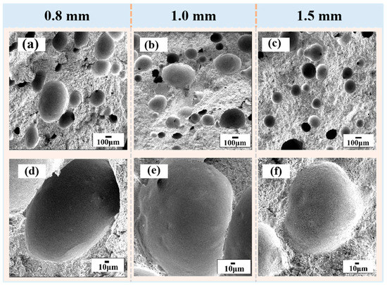 SEM micrographs of the SiC green bodies for different nozzle diameters: (a,d) the cross-sectional views of the 0.8 mm diameter, (b,e) the cross-sectional views of the 1.0 mm diameter, and (c,f) the cross-sectional views of the 1.5 mm diameter.