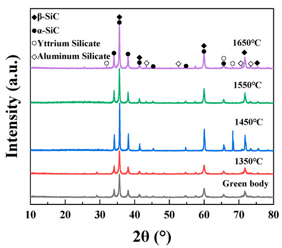XRD patterns of the SiC green body and the porous SiC-sintered ceramics sintered at different sintering temperatures.