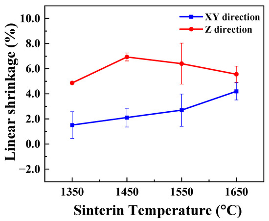 Figure 6 shows the XRD patterns of the SiC green body and the porous SiC-sintered ceramics sintered at different sintering temperatures. As shown in Figure 6, the as-sintered porous SiC ceramics consisted mainly of α-SiC (PDF card No. 49-1428) and β-SiC (PDF card No. 29-1129), and the results indicated that SiC ceramics were successfully fabricated. Additionally, the yttrium silicate and aluminum silicate phases were also observed in the samples when the sintering temperature exceeded 1450 °C, which implied a reactive sintering between the added sintering aids. These results proved that the composite additives could effectively reduce the sintering temperature of porous SiC ceramic [45]. We also investigated the variation in shrinkage in porous SiC ceramics sintered at different sintering temperatures. The shrinkage percentages were 1.51%, 4.86%, 4.20%, and 5.56% when the sintering temperatures were 1350 °C, 1450 °C, 1550 °C, and 1650 °C, respectively, as shown in Figure 7. The volume changes of the samples before and after sintering were relatively small, which was attributed to the fact that the sintering mechanism between the particles of the solid-state-sintered porous SiC ceramic was mainly surface diffusion [46]. It was also observed that the line shrinkage in the xy-direction was slightly lower than that in the z-direction for all ceramics. Since the layer-by-layer printing principle governs the DIW-based 3D-printing process, the difference in the different directions might be due to the inconsistency between the stacking density within the layers and between the layers [47].