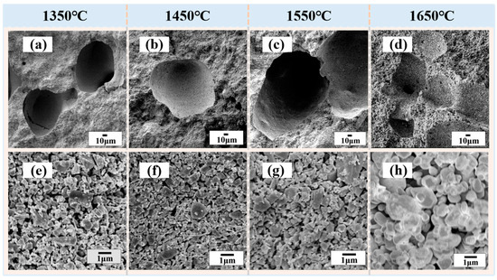 Cross-section SEM micrographs of the porous SiC ceramics sintered at different sintering temperatures: (a,e) 1350 °C, (b,f) 1450 °C, (c,g) 1550 °C, and (d,h) 1650 °C.